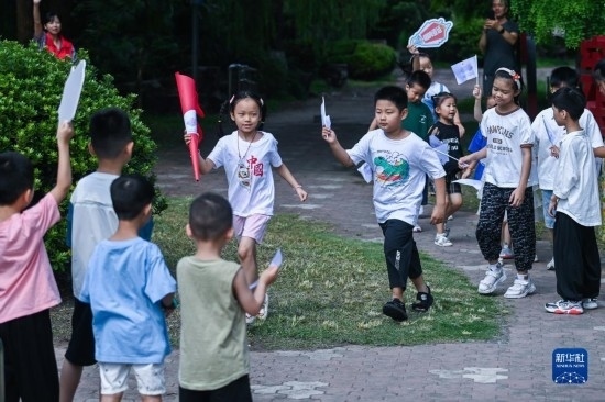 8月24日,在湖州市龍泉街道白魚潭社區(qū),孩子們拿著自己制作的火炬,參與趣味火炬?zhèn)鬟f活動。
