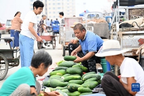 8月25日,在天津市靜海區(qū)臺頭鎮(zhèn),商戶為前來趕集的村民挑選臺頭西瓜。