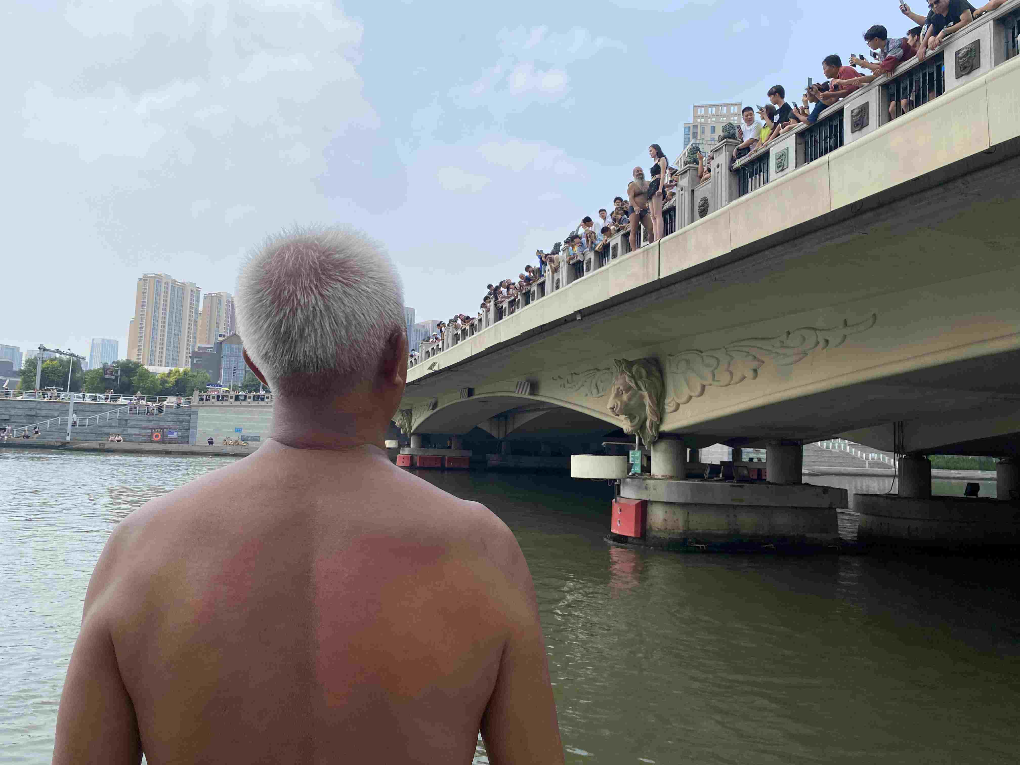 ▲海河邊圍觀跳水的人群