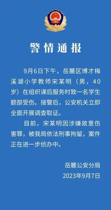 ·長沙岳麓警方:打傷學(xué)生老師涉嫌故意傷害罪被刑拘。此前,長沙岳麓區(qū)教育局通報:該校黨總支書記和涉事教師停職。