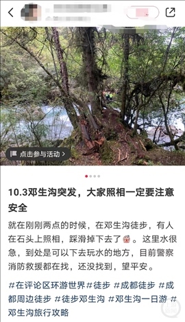 10月3日,游客艾女士(化名)發(fā)布圖片稱,當(dāng)天下午2點左右,在鄧生溝徒步,有人照相時踩滑掉落水里,水流非常湍急?!笆钦驹谑^上照相,踩滑了掉下去。聽到落水者兒子哭著給家里人打電話說的。”她還向上游新聞記者表示,落水者是一位女游客,事情發(fā)生后,警方、消防等都在展開救援。多位游客表示,該女游客已被找到,不過已經(jīng)去世。