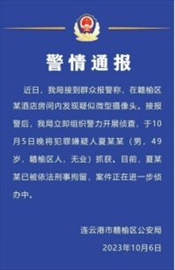 ·連云港警方通報(bào)酒店房間發(fā)現(xiàn)微型攝像頭:49歲犯罪嫌疑人夏某某已被刑拘。