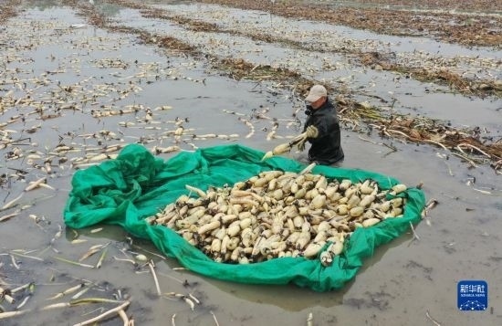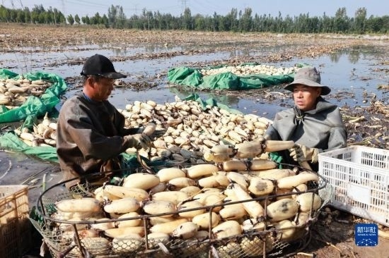 10月5日,河北省新河縣西流鄉(xiāng)西董村一家蓮藕種植合作社的社員在收獲蓮藕。