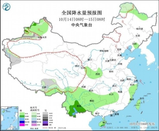 10月13日08時至14日08時,新疆西部、西藏南部等地部分地區(qū)有小雪或雨夾雪;四川南部、貴州中南部、云南大部等地部分地區(qū)有中到大雨,其中,云南東部局地有暴雨(50~80毫米)。新疆西北部、河北北部等地部分地區(qū)有5~6級風;臺灣海峽、巴士海峽、南海北部海域、北部灣等海域有5~7級風、陣風8級。(見圖2)。