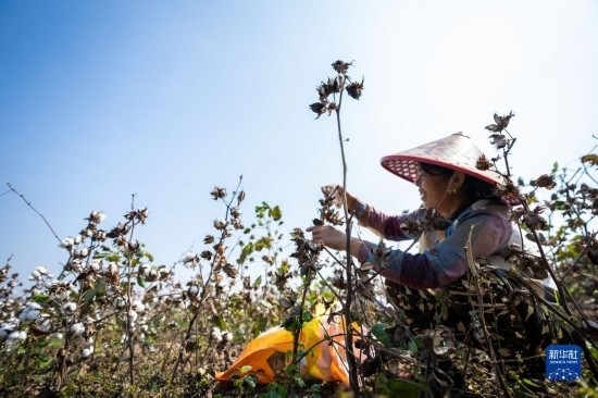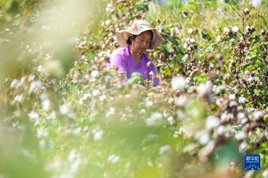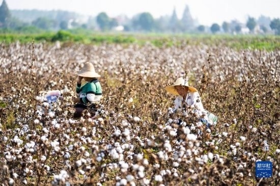 金秋十月,湖南省益陽市南縣種植的4萬余畝棉花相繼進入采收季,當(dāng)?shù)孛揶r(nóng)趁著晴好天氣采摘棉花,田間地頭一片忙碌的景象。