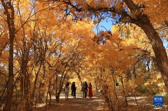 10月17日,游客在甘肅省敦煌市莫高鎮(zhèn)的胡楊林中賞景。