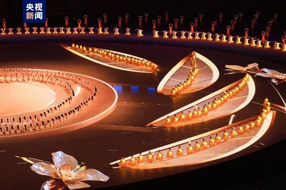 今晚的“大蓮花”,處處見桂花,時時聞得到桂花香。一朵“金桂之花”到22組金桂花團,從分散到匯聚,時而形成流水,時而形成拱橋,最終將在空中形成巨大的“金桂花冠”,向每一位運動員傳遞“逐夢折桂”的美好寓意。