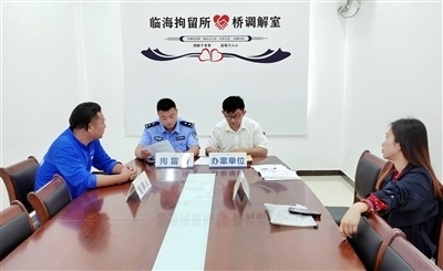 圖④:臨海法院執(zhí)行法官與拘留所民警共同開(kāi)展調(diào)解,促成雙方當(dāng)事人達(dá)成執(zhí)行和解。