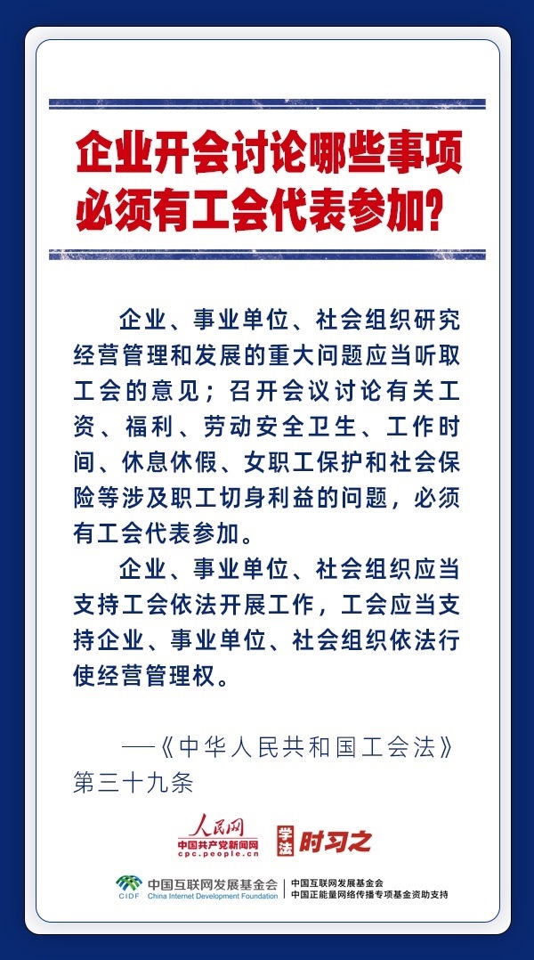 日前,中華全國總工會新一屆領(lǐng)導(dǎo)班子產(chǎn)生。黨和政府歷來重視工會的地位作用,十分注重加強工會法律制度建設(shè),專門為廣大職工制定了《中華人民共和國工會法》。網(wǎng)約車司機、快遞員、外賣配送員能入工會嗎?產(chǎn)業(yè)工人隊伍建設(shè)改革的目標是什么?企業(yè)開會討論哪些事項必須有工會代表參加?一起來了解。
