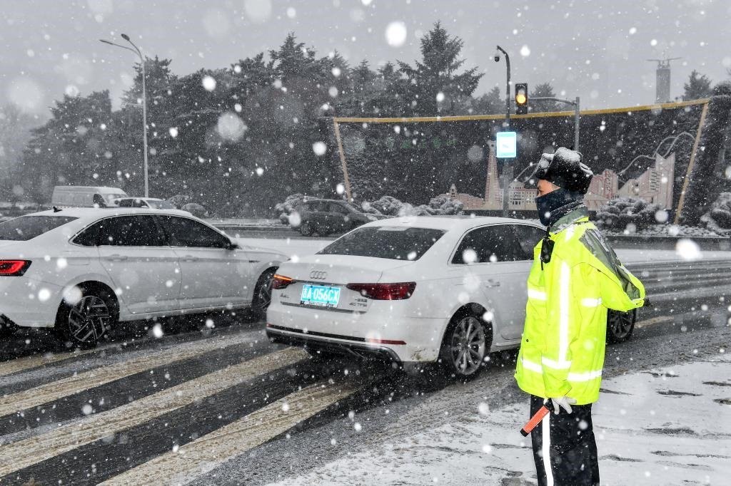 6日,在吉林省長春市,一名執(zhí)勤交警在雪中指揮交通。新華社記者許暢 攝