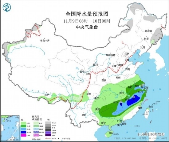 圖2 全國降水量預報圖(11月8日08時-9日08時) 圖片來源:中央氣象臺網(wǎng)站