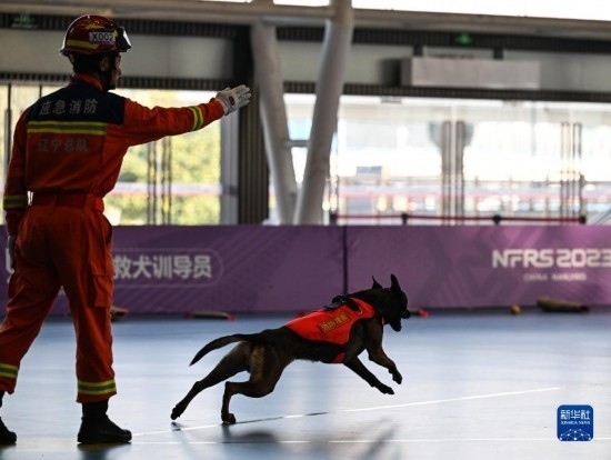 11月8日,搜救犬訓導員和搜救犬在比賽中。