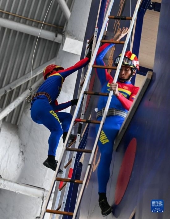 11月8日,消防員在進行攀登掛鉤梯比賽。