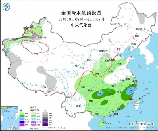 11月9日08時至10日08時,新疆西部、內(nèi)蒙古東北部、黑龍江大部、吉林中東部、遼寧東北部等地部分地區(qū)有小到中雪或雨夾雪,其中,黑龍江東部、吉林東部、新疆南疆西部山區(qū)等地部分地區(qū)有大雪,局地暴雪。重慶東南部、貴州東部、湖北東部、湖南大部、蘇皖南部、上海、江西中北部、浙江大部、福建西北部以及廣西東北部等地部分地區(qū)有中到大雨,其中,江西西部和東北部、浙江西南部、福建西北部等地部分地區(qū)有暴雨(50~80毫米)。內(nèi)蒙古中東部、遼寧大部、華北東部和北部、黃淮北部、江南東部等地部分地區(qū)有4~6級風(見圖3)。