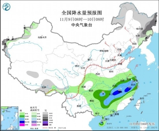 圖3 全國降水量預報圖(11月9日08時-10日08時) 圖片來源:中央氣象臺網(wǎng)站