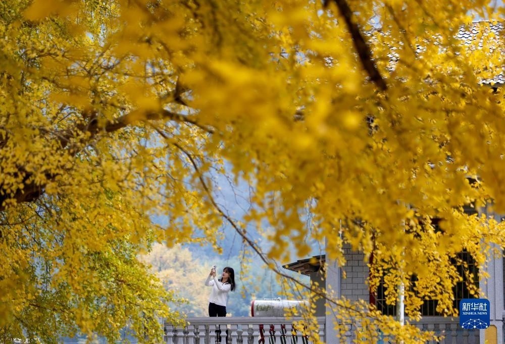 11月24日,游客在貴州省遵義市正安縣謝壩仡佬族苗族鄉(xiāng)上關(guān)村拍攝古銀杏樹。
