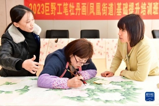 12月2日,在巨野縣鳳凰街道鳳麟社區(qū),來(lái)自巨野書畫院的畫師魏蘭蘭(左一)在工筆牡丹畫基礎(chǔ)提升培訓(xùn)班上指導(dǎo)學(xué)員作畫。