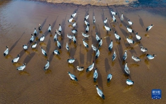 這是12月5日清晨在拉薩市林周縣虎頭山水庫(kù)拍攝的越冬黑頸鶴(無(wú)人機(jī)照片)。