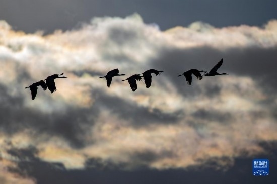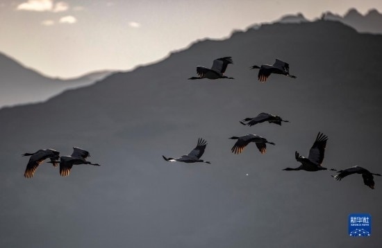 這是12月5日清晨在拉薩市林周縣虎頭山水庫(kù)拍攝的越冬黑頸鶴。