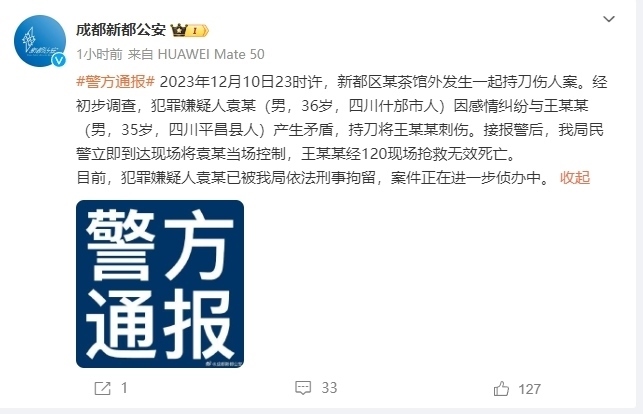 ·成都新都區(qū)一茶館外發(fā)生持刀傷人案,警方通報:系因感情糾紛,致一人死亡。