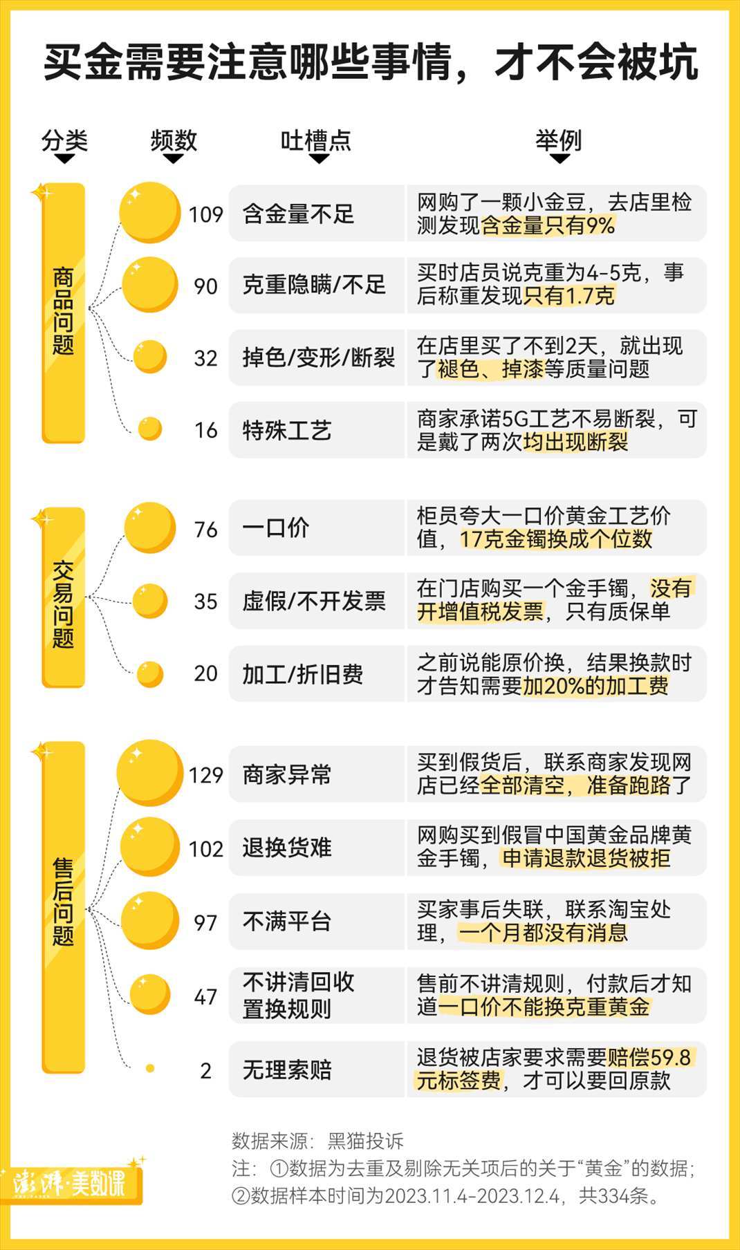 通過梳理黑貓投訴2023年所有關(guān)于“黃金”的消費(fèi)糾紛,澎湃新聞發(fā)現(xiàn)無論是在網(wǎng)購還是線下,品牌店還是非品牌店,購買黃金都有可能踩坑。