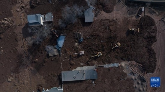 12月19日,救援機械和人員在青海省海東市民和回族土族自治縣中川鄉(xiāng)金田村清理地震引發(fā)的砂涌(無人機照片)。