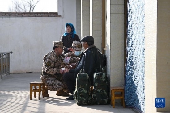 12月19日,武警青??傟牶|支隊衛(wèi)生隊醫(yī)師在青海省海東市民和回族土族自治縣中川鄉(xiāng)草灘村開展醫(yī)療保障。