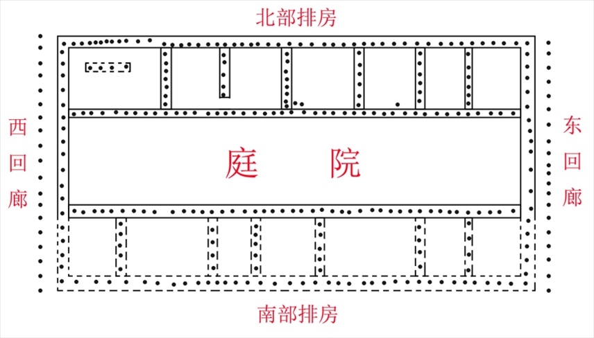“結(jié)合以往考古發(fā)掘成果來看,古城寨遺址城內(nèi)中部偏東區(qū)域為宮殿核心區(qū)?!崩畈┱f,“新發(fā)現(xiàn)的1號夯土臺基、東部夯土遺跡,與以往發(fā)現(xiàn)的宮殿建筑基址、廊廡基址一道,在平面布局上構(gòu)成了四合院式的宮殿建筑群?!?/p>