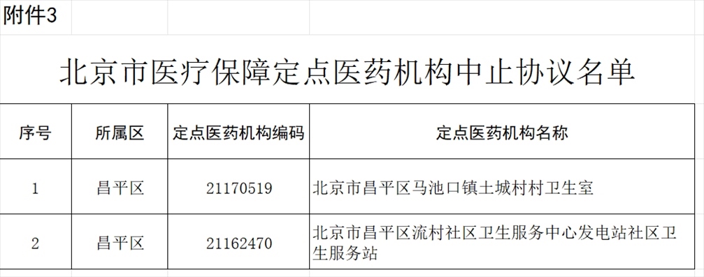 北京市昌平區(qū)馬池口鎮(zhèn)土城村村衛(wèi)生室等2家定點(diǎn)醫(yī)藥機(jī)構(gòu)因不能繼續(xù)為參保人員提供服務(wù),申請(qǐng)中止協(xié)議,經(jīng)市、區(qū)醫(yī)保經(jīng)辦機(jī)構(gòu)審核,現(xiàn)決定對(duì)上述2家定點(diǎn)醫(yī)藥機(jī)構(gòu)中止協(xié)議(見附件3)。