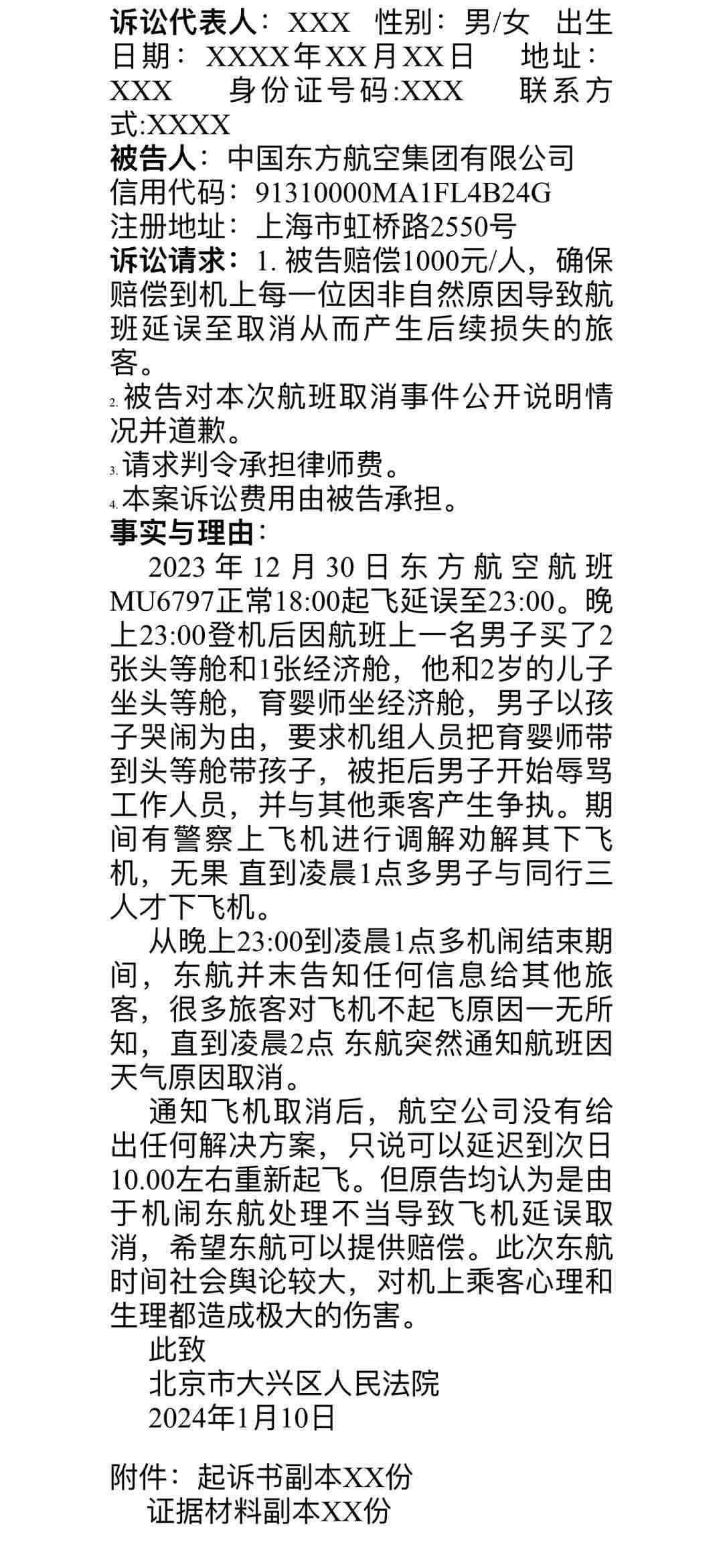 群內(nèi)發(fā)出的起訴書寫道:“從當日23點到次日凌晨1點多機鬧結(jié)束期間,東航并未告知任何信息給其他旅客,很多旅客對飛機不起飛原因一無所知,直到凌晨2點,東航突然通知航班因天氣原因取消。通知飛機取消后,航空公司沒有給出任何解決方案,只說可以延遲到次日10點左右重新起飛。但原告均認為是由于機鬧,東航處理不當,導致飛機延誤取消,希望東航可以提供賠償。此次東航事件社會輿論較大,對機上乘客心理和生理都造成極大的傷害?!睋?jù)悉,乘客們擬起訴至北京市大興區(qū)人民法院。