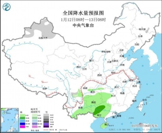 全國降水量預(yù)報圖(1月12日08時-13日08時)