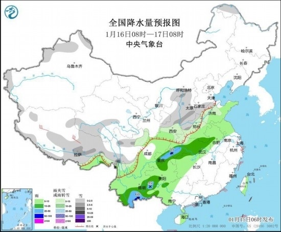 1月15日08時(shí)至16日08時(shí),新疆北部、西藏東部、甘肅東部、陜西、山西中南部、河南、山東西部、安徽北部等地的部分地區(qū)有小到中雪或雨夾雪,其中新疆阿勒泰、陜西南部、山西南部、河南西部等地的部分地區(qū)有大雪,局地暴雪(10~12毫米),陜西南部、湖北西北部局地有凍雨;西南地區(qū)東部、江漢中部、江南西部、廣西中西部、云南中南部、海南島等地有小到中雨,其中重慶、湖北西南部等地的部分地區(qū)有大雨(25~45毫米)。浙江中東部、西藏等地的部分地區(qū)有4~6級風(fēng),其中西藏中部的部分地區(qū)風(fēng)力可達(dá)7級以上;臺(tái)灣海峽有7~8級、陣風(fēng)9級的東北風(fēng),東海、南海中北部和西南部有5~7級風(fēng),陣風(fēng)8級(見圖1)。