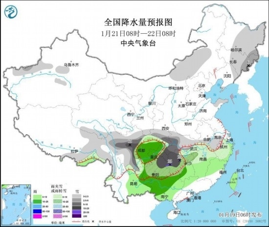 1月21日08時(shí)至22日08時(shí),內(nèi)蒙古中部、東北地區(qū)中東部、新疆南疆盆地西部、西藏南部和東部、青海南部、川西高原、陜甘南部、湖北大部、安徽南部、浙江大部、江西北部、湖南中北部、貴州大部等地部分地區(qū)有小到中雪或雨夾雪,其中,川西高原東部、湖北西南部、湖南西北部、重慶東部、貴州東北部等地部分地區(qū)有大到暴雪,局地大暴雪(20~25毫米)。江南中南部、西南地區(qū)東部和南部、華南北部和西部、臺(tái)灣島等地部分地區(qū)有小到中雨。內(nèi)蒙古中東部、東北地區(qū)西部部分地區(qū)有4~5級(jí)風(fēng)。渤海、黃海大部、東海大部、臺(tái)灣海峽、南海北部和西南部海域?qū)⑾群笥?~7級(jí)、陣風(fēng)8級(jí)的東北到偏北風(fēng)(見圖3)。