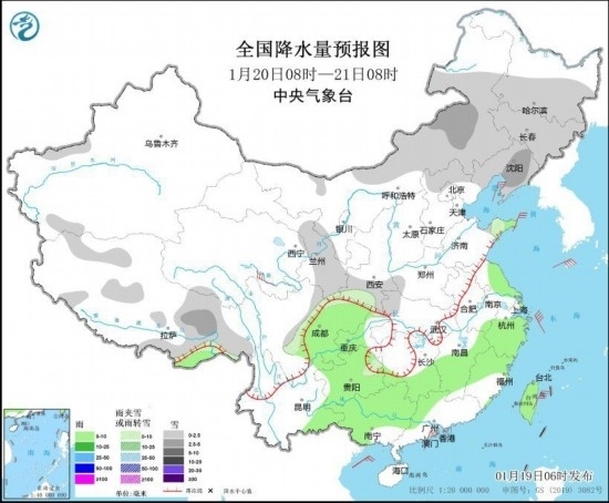 圖1 全國降水量預(yù)報(bào)圖(1月19日08時(shí)-20日08時(shí))