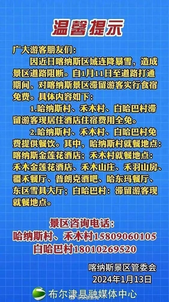 1月13日,喀納斯景區(qū)發(fā)布公告稱,對滯留游客實行食宿免費 來源網絡
