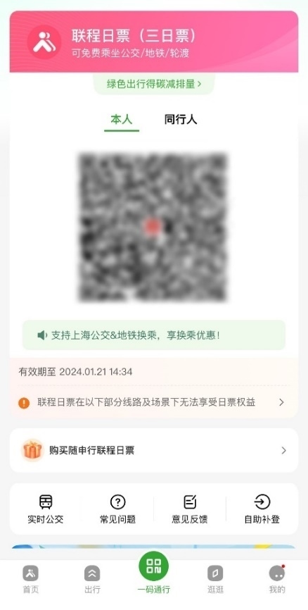 即日起,市民登錄上海市綠色出行一體化平臺“隨申行”APP,購買并啟用“聯(lián)程日票”,即可在有效時間內(nèi)不限次乘坐上海地鐵、公交和輪渡。老人、小孩同行時,支持為同行人購買聯(lián)程日票。