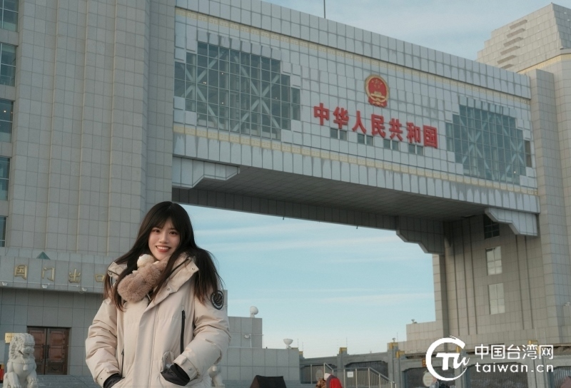 1月27日,2024年全國(guó)臺(tái)聯(lián)第三十屆臺(tái)胞青年冬令營(yíng)內(nèi)蒙古分營(yíng)一行人前往中俄第五代國(guó)門(mén)參訪,陳紀(jì)陵于中俄第五代國(guó)門(mén)前“打卡”留念。(臺(tái)灣同學(xué) 王奕勛 攝)