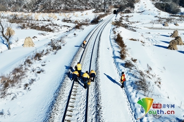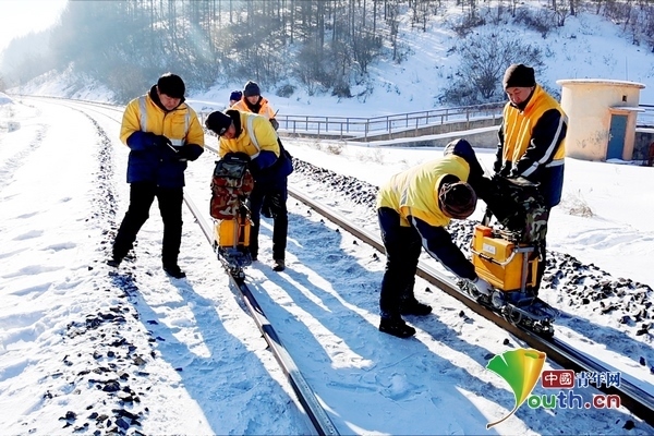 兩臺超聲波鋼軌探傷儀,在身穿橙黃色工作服的探傷工的推行下,緩緩向線路遠方走去。寒風(fēng)中,探傷工們從頭到腳的防寒裝備也為他們在冬季室外作業(yè)提供了保障。