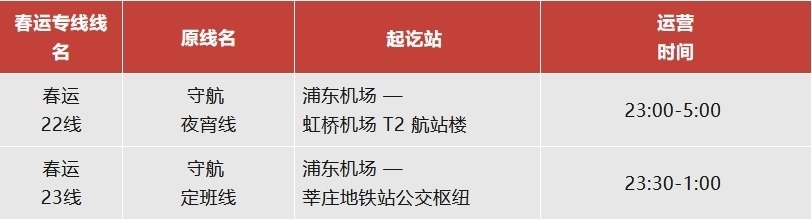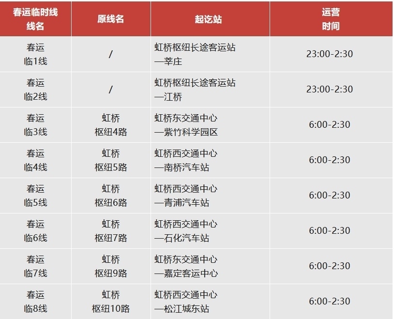 注:虹橋樞紐春運(yùn)專線運(yùn)營日期為2月14日至3月5日。