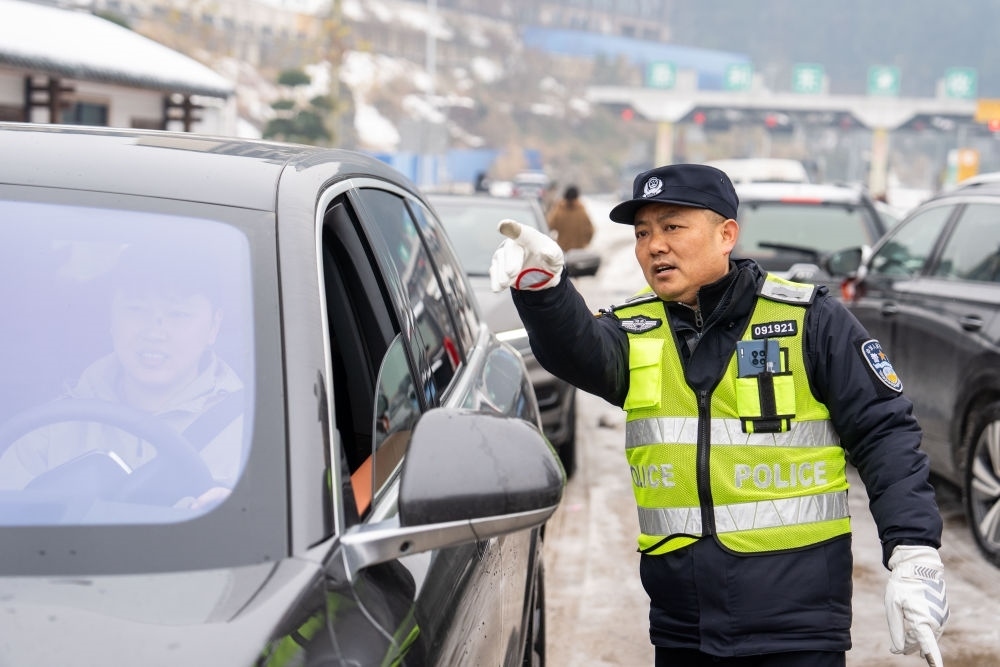 在湖南長張高速慈利東收費(fèi)站附近,交警解答旅客的提問(2月6日攝)。新華社記者 陳思汗 攝