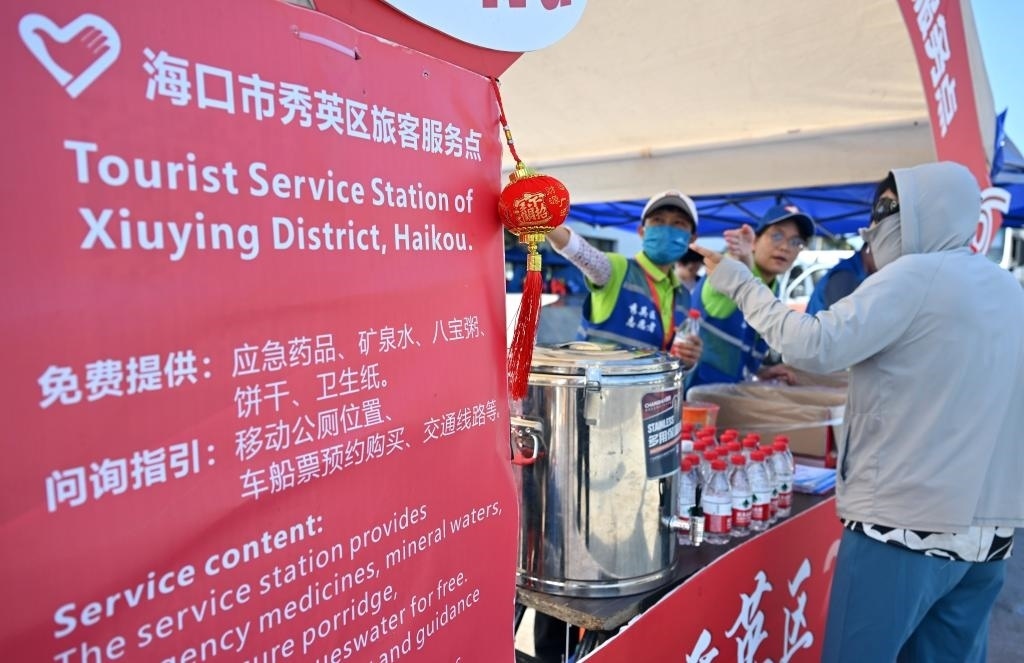 記者在新海港附近一處旅客服務(wù)點看到,幾位志愿者在向旅客發(fā)放免費礦泉水和餅干。
