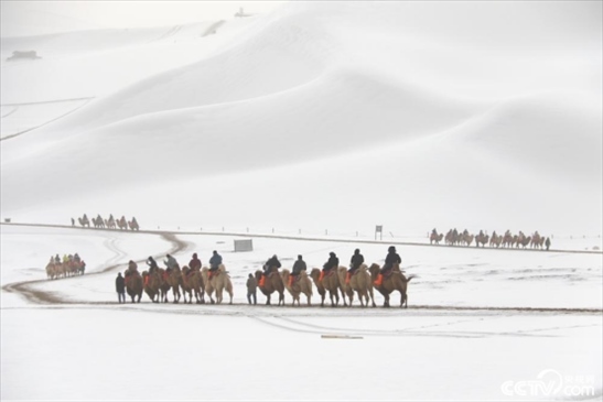 2024年2月18日,甘肅酒泉,游客在敦煌市鳴沙山月牙泉景區(qū)游覽。雪后的甘肅省敦煌市鳴沙山月牙泉景區(qū)銀裝素裹,景色如畫,游客徜徉其中,欣賞大漠雪景,體驗絲路風(fēng)情。