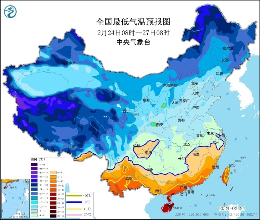 中央氣象臺2月24日06時繼續(xù)發(fā)布低溫黃色預警: