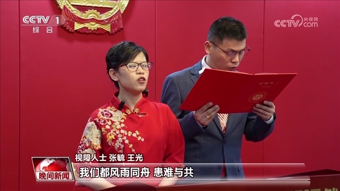 視障人士 張毓 王光:相濡以沫,鐘愛(ài)一生,今后無(wú)論順境還是逆境,無(wú)論富有還是貧窮,無(wú)論健康還是疾病,無(wú)論青春還是年老,我們都風(fēng)雨同舟,患難與共,成為終生的伴侶。