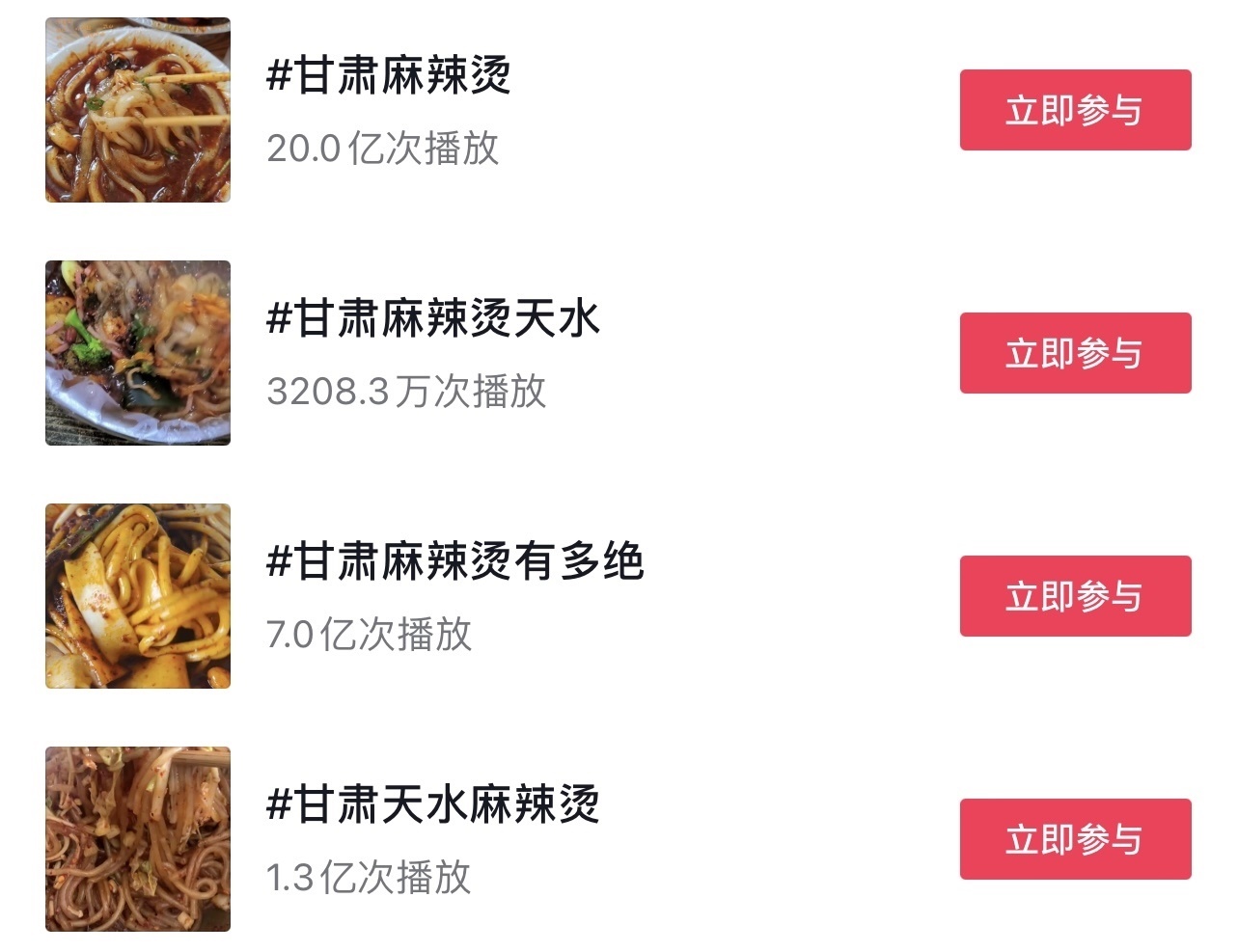 “這兩條視頻吸引了大量網(wǎng)民觀看、點贊、轉(zhuǎn)發(fā),之后陸續(xù)有網(wǎng)民發(fā)布相關(guān)視頻?!?月18日,甘肅省文化和旅游廳在回復(fù)網(wǎng)友建議中提到,3月份以來,“甘肅麻辣燙”話題迅速發(fā)酵,視頻內(nèi)容迅速增加,多次登上抖音、快手等短視頻平臺熱榜。截至3月16日18:00,各大短視頻平臺上“甘肅麻辣燙”相關(guān)話題累計播放量已超過32.6億次。