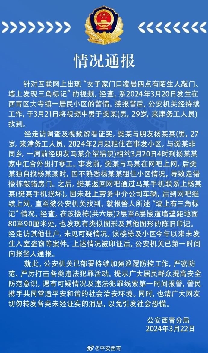 經(jīng)走訪調查及視頻辨看證實,樊某與朋友楊某某(男,27歲,來津務工人員,2024年2月起租住在事發(fā)小區(qū),與樊某非同鄉(xiāng),一周前經(jīng)朋友馬某介紹結識)相約3月20日4時到楊某某家中匯合外出打零工。事發(fā)前,樊某與馬某在網(wǎng)吧上網(wǎng),后樊某獨自找楊某某時,因不熟悉楊某某租住小區(qū)情況,導致走錯樓棟敲錯房門。之后,樊某返回網(wǎng)吧通過馬某手機聯(lián)系上楊某某(樊某手機損壞),因未趕上勞務中介公司車輛,后到網(wǎng)吧繼續(xù)上網(wǎng),直至被公安機關找到。就報警人所述“墻上有三角標記”情況,經(jīng)查,在該樓棟(共六層)2層至6層樓道墻壁距地面80至90厘米處,也發(fā)現(xiàn)有類似圖形及其他圖形的陳舊印記經(jīng)走訪其他住戶,未見可疑情況,該樓棟及小區(qū)今年以來未發(fā)生入室盜竊等案件。上述情況被印證后,公安機關已第一時間向報警人通報。
