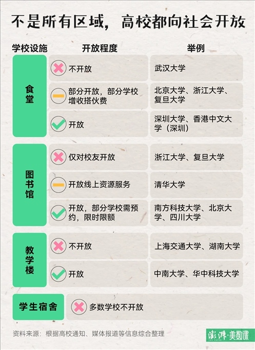 最令在校學(xué)生頭疼的要與游客爭(zhēng)搶學(xué)校資源的問(wèn)題,例如食堂、圖書館和教學(xué)樓等,各個(gè)學(xué)校在決定開放校園的同時(shí)也給出了相關(guān)規(guī)定。