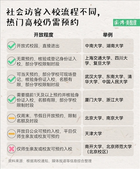 還有學(xué)校在訪客人數(shù)、開放時(shí)間上,做出了限制:清華大學(xué)工作日開放 2000 個(gè)名額,周末、節(jié)假日增加至 1.2 萬(wàn)個(gè);北大、南大等學(xué)校工作日不開放,學(xué)期內(nèi)僅周末和法定節(jié)假日開放。