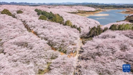 近日,貴州省貴安新區(qū)櫻花園內(nèi)的2.4萬畝櫻花迎來盛花期,花團錦簇,春意盎然,吸引各地游客前來賞花游玩。?