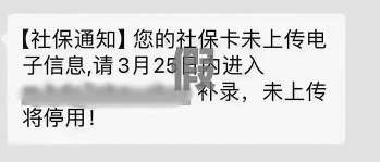 套路一 通過不明號碼打電話或發(fā)送詐騙短信,自稱人社或醫(yī)保部門的工作人員,用“社保卡異常將被強(qiáng)制停用”“社??ㄉ墶薄半娮由绫?▽徍宋赐ㄟ^”等理由,要求持卡人配合處理,索取持卡人的個人信息,誘騙持卡人轉(zhuǎn)賬匯款,實施詐騙。